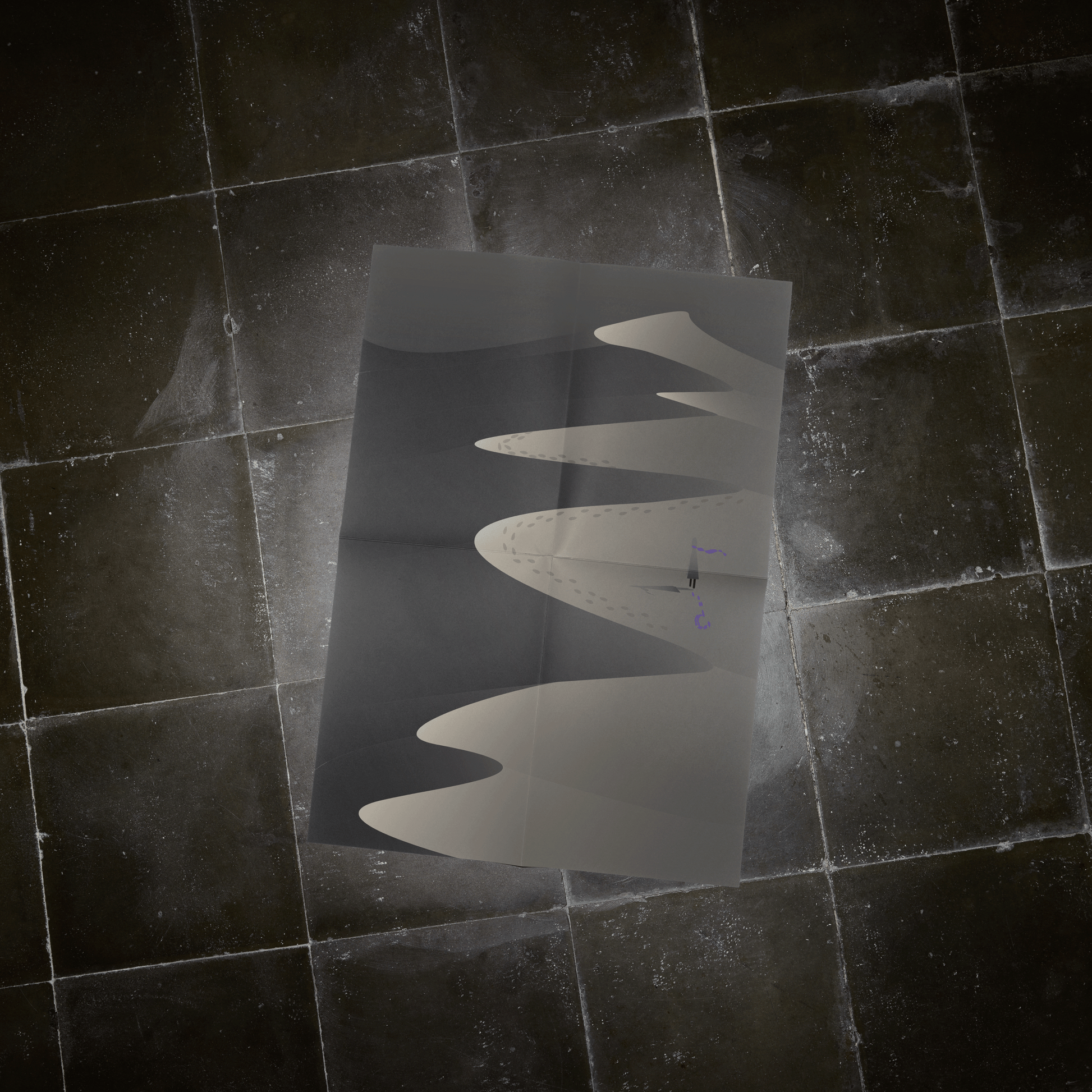 Les traces suggèrent des directions possibles, tandis que la figure centrale incarne l’hésitation et la réflexion.