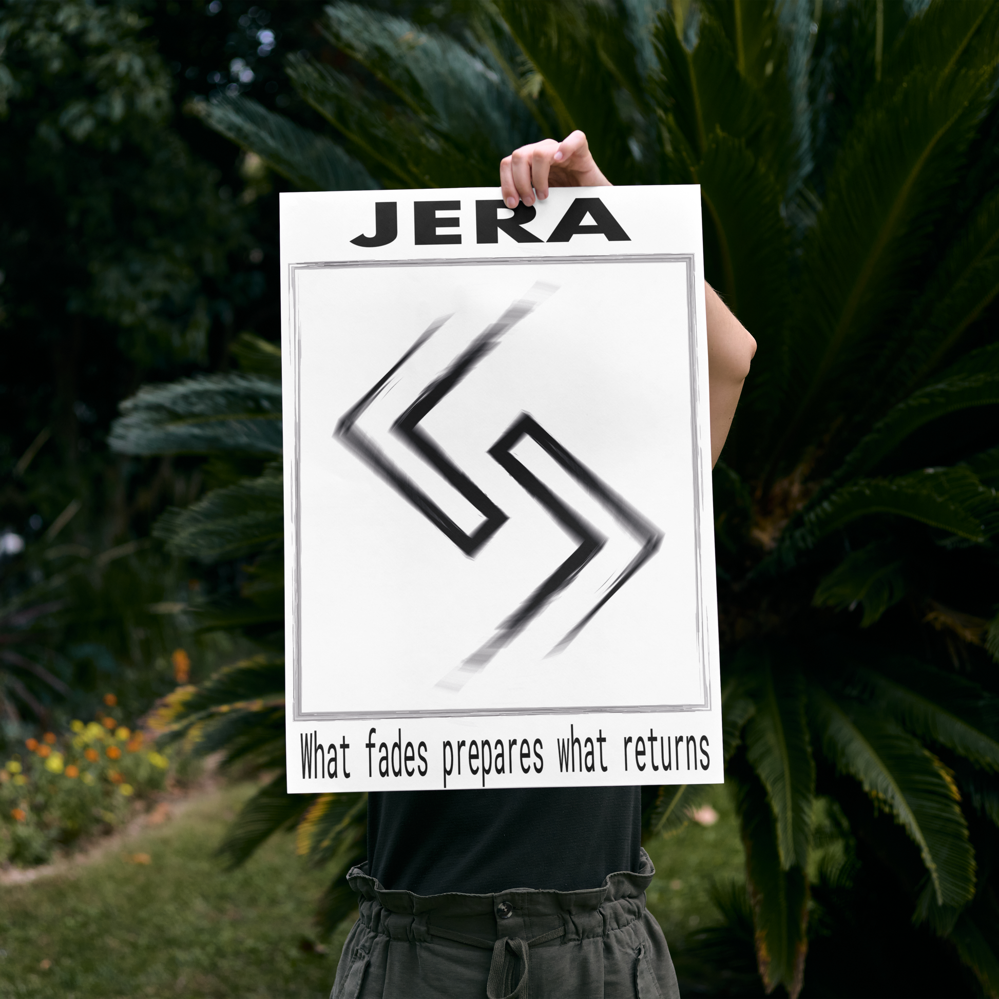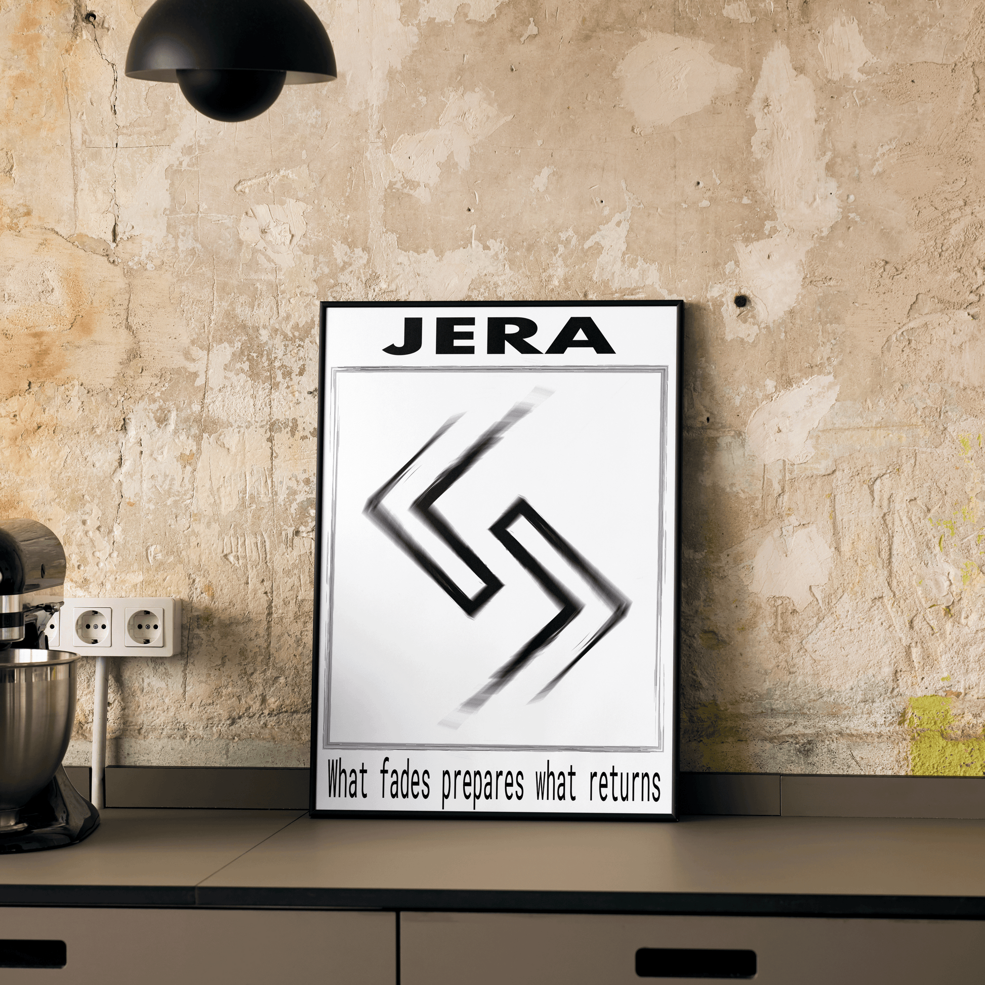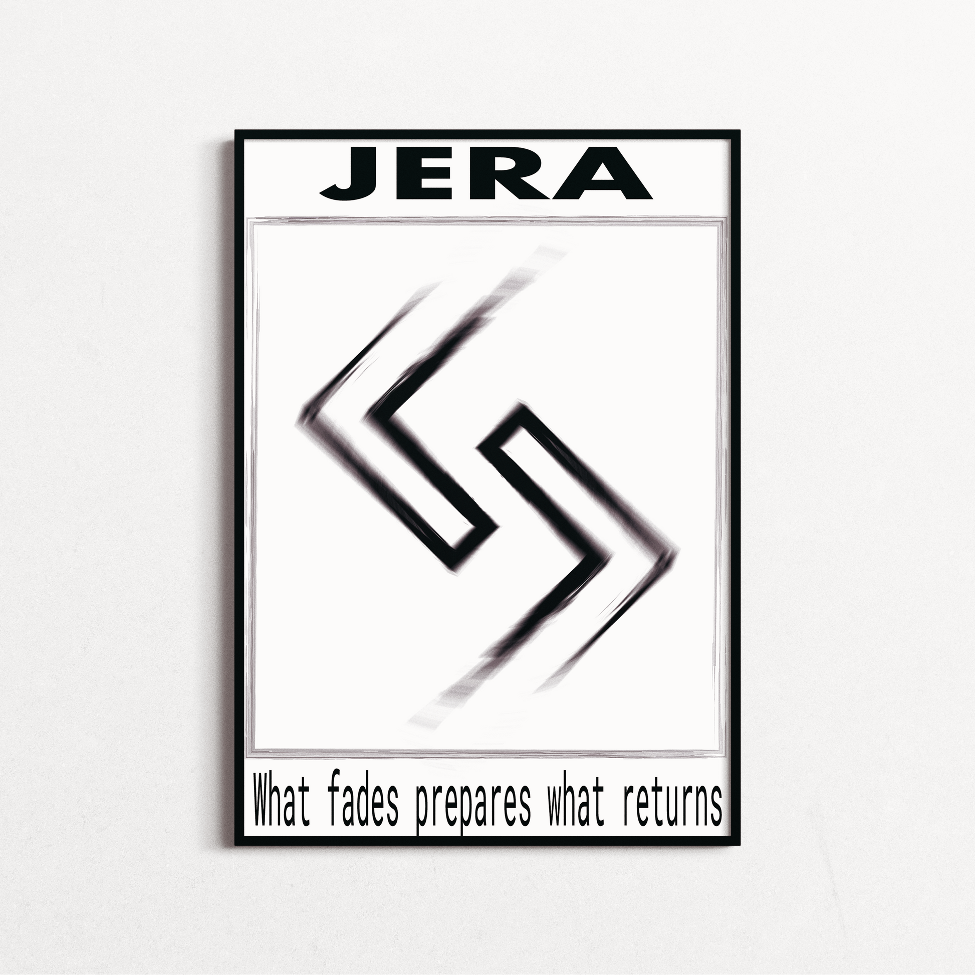 Symbole de cycle et de renouveau : cette œuvre inspirée de la rune Jera évoque le temps, la patience et la récompense des efforts. Ses lignes nettes et équilibrées rappellent les mouvements naturels qui nous ramènent toujours vers un nouvel équilibre.